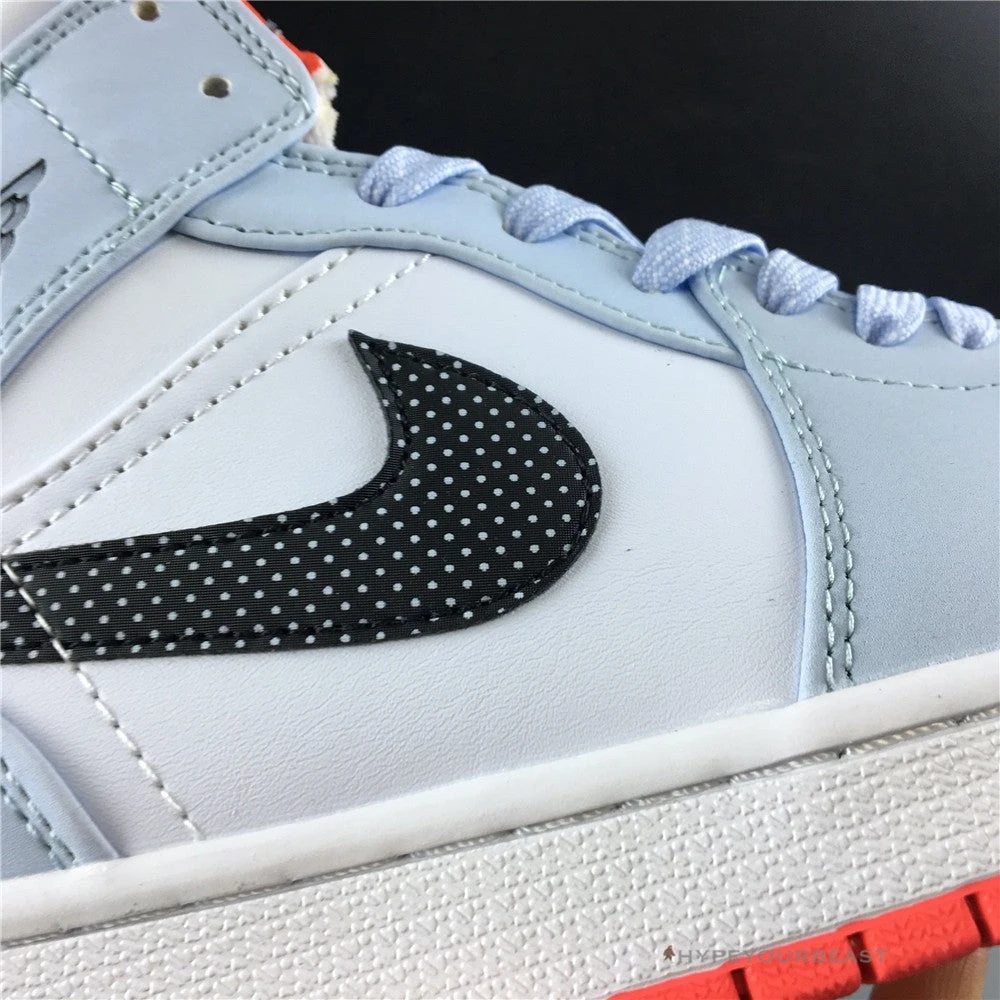Air Jordan 1 Mid Half Blue has a simple but awesome colorway of half blue, black, white, and red. Its main highlight is its black Nike Swoosh with white polka dots. It gives extra spice to the clean white bases and half blue overlays on the toe cap, laces, ankle, and heel. To further make the sneakers interesting, Air Jordan 1 Mid Half Blue Polka Dot Swoosh brings out red outsoles. Own a pair of these shoes and experience both the cushy feels and unique look on your feet.