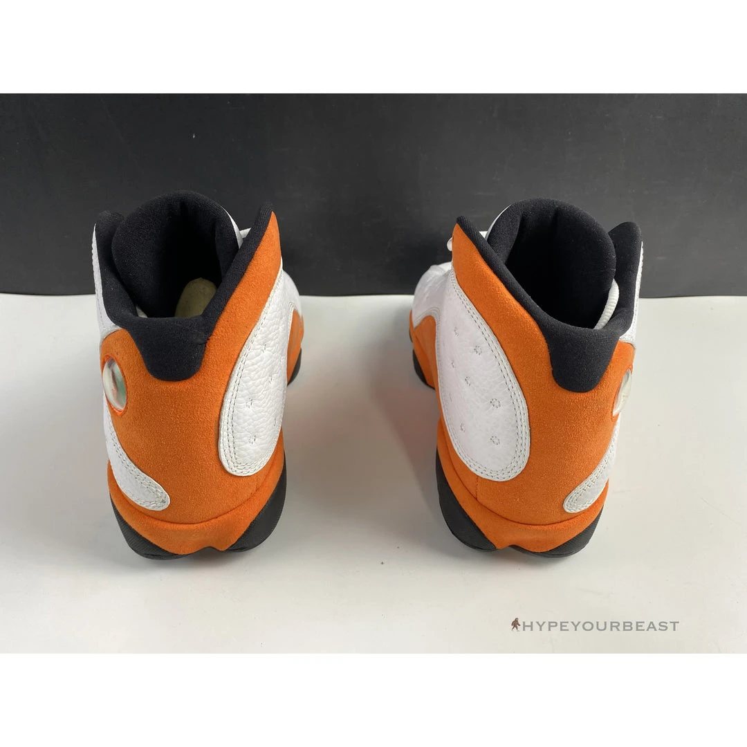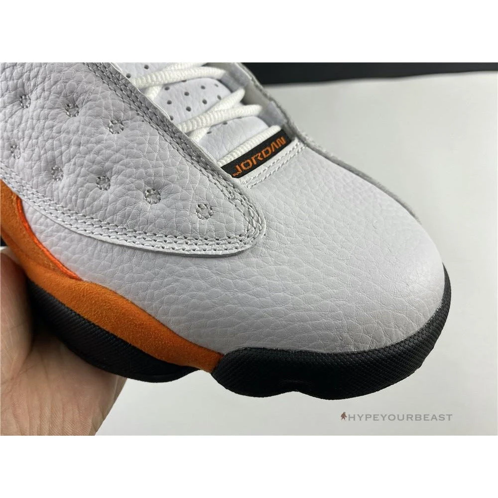 Bringing back the “ Air Jordan 1 Shattered Backboard” colorway is the main feature of Air Jordan 13 Retro Starfish as it also owns white and orange tones. It only differs from the styling, accenting, and overall construction of the sneakers. Air Jordan 13 Retro Starfish showcases white tumbled leather as the bases with orange suede overlays on the heel, mudguard, and midsoles. Completing the Air Jordan 13 classic features are the extra holographic eye on the lateral ankle, Jumpman logo on the tongue, and panther-paw on the black rubber outsoles. Claiming one of these sneakers stands your feet from the ground!