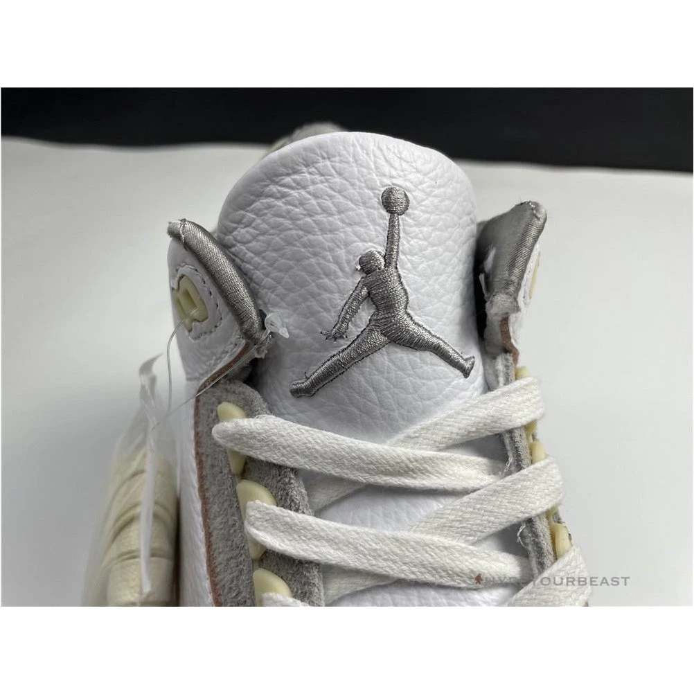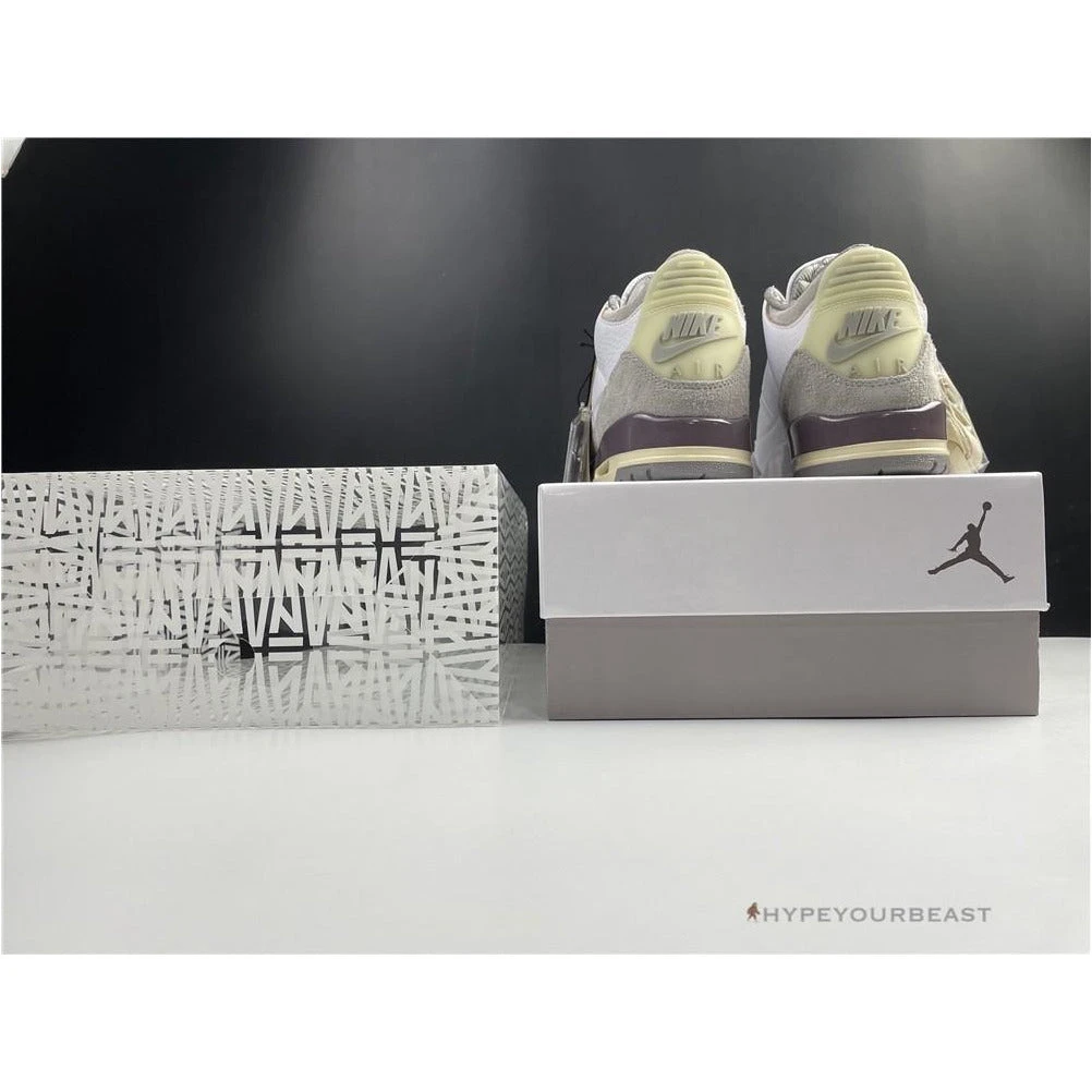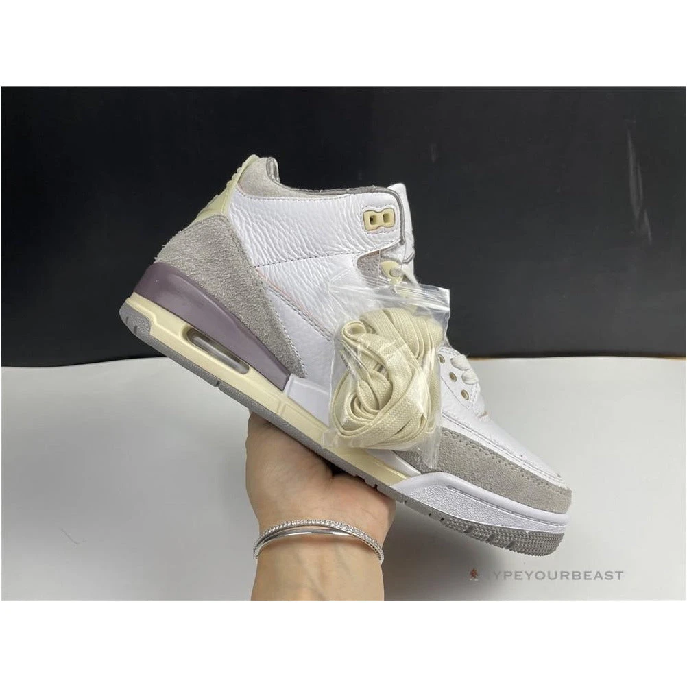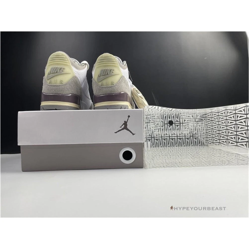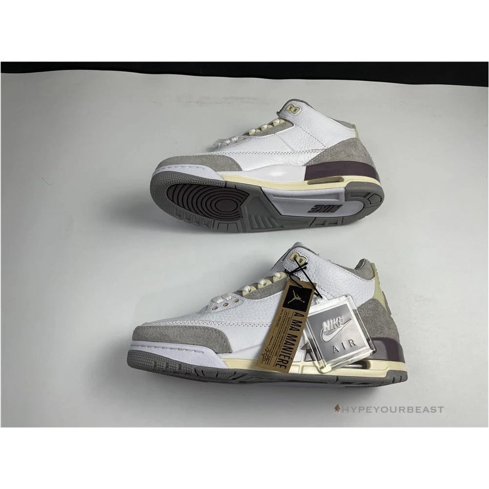 Air Jordan 3 A Ma Maniere brings out incredible touch on your feet due to its sleeking white and monochrome features. These sneakers have a premium white leather upper with soft grey suede overlays. The grey touch is present in the eyelets, heels, toes, and even on the collars. Air Jordan 3 A Ma Maniere also showcases mismatched Jumpman logo and A Ma Maniere logo on the tongue, making it more unique than other Air Jordan 3. These white kicks are completed with purple accents on the heels, cream hue mold near the visible Air sole technology.