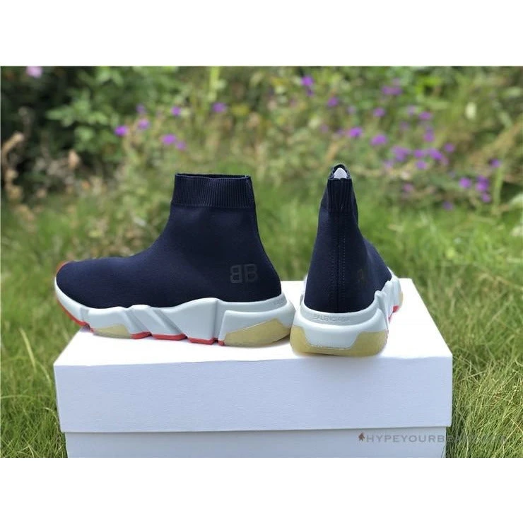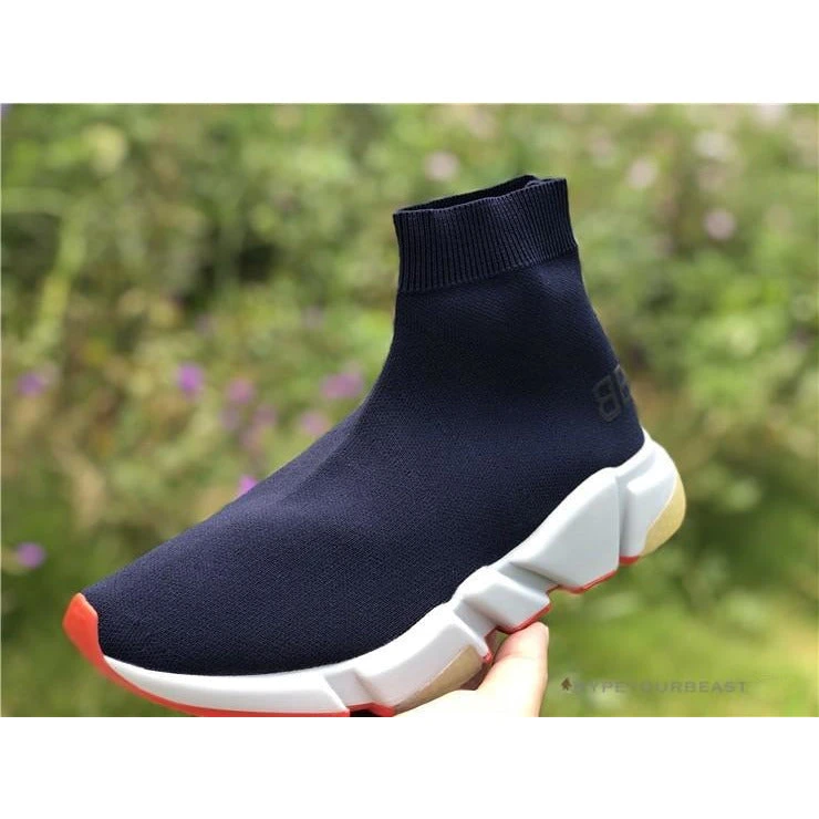 Unlike the typical Balenciaga Sock Sneakers with the black colorway, Balenciaga Speed Trainer Blue Marine includes blue marine, white, and red color combinations. It has neat material in blue material which was made from 3D knitting. This pair also includes white midsoles and neon red rubber outsoles. Another special feature of Balenciaga Speed Trainer Blue Marine is its double initial logo at the heel. Grabbing one of these sneakers can guarantee comfort, easy, and cushy performance.
