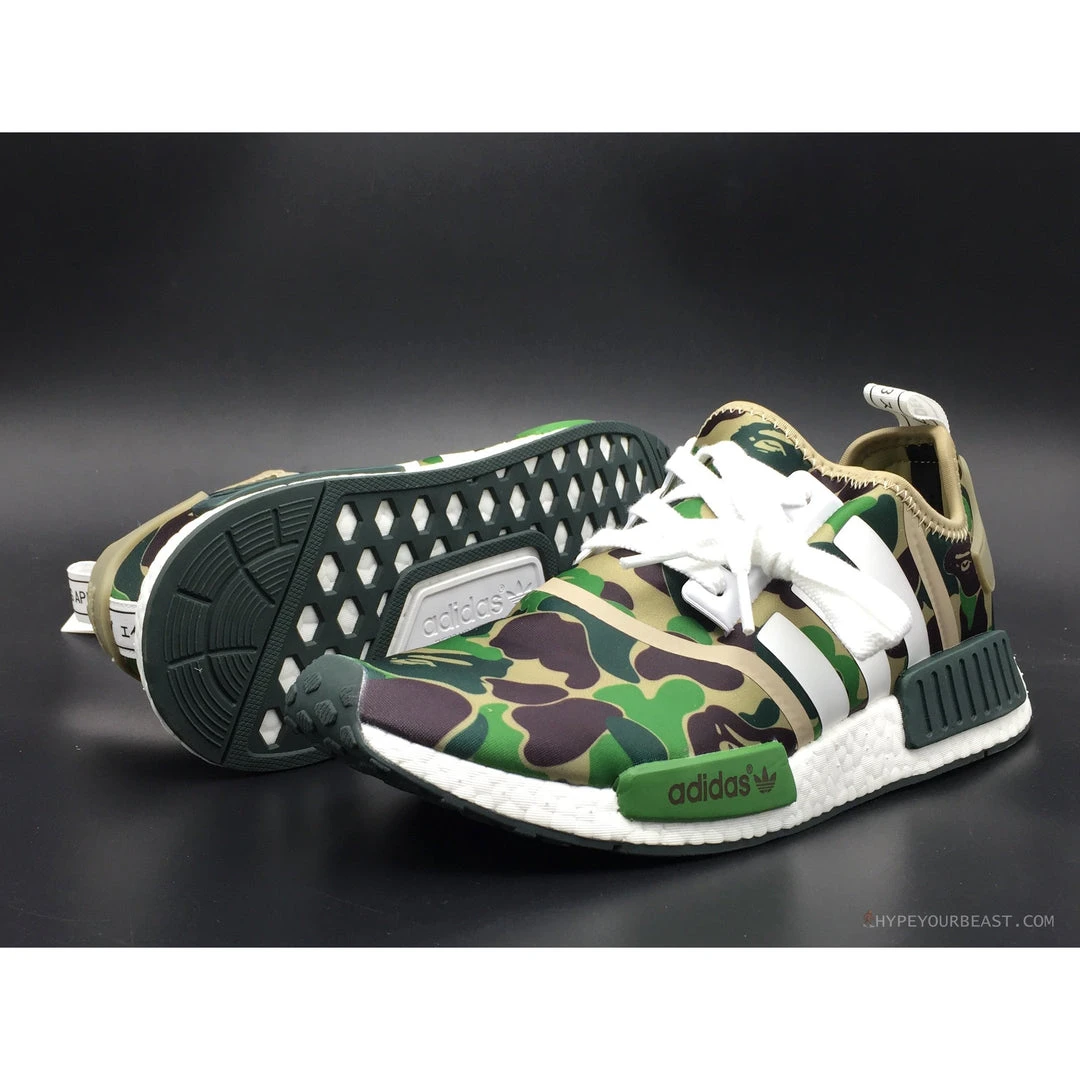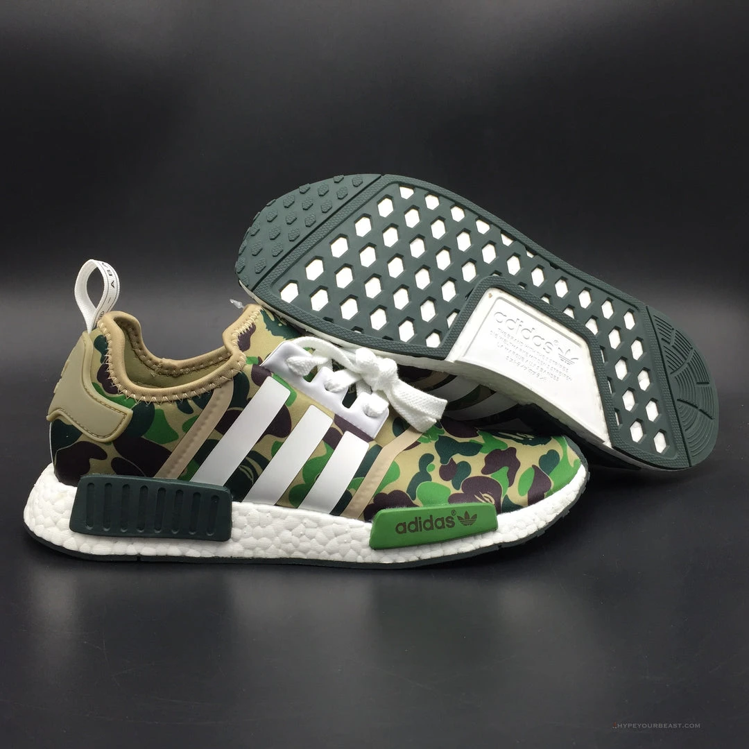 Camouflage sneakers have leveled up its game through the Bathing Ape x Adidas NMD R1 Green Camo which features green and tan accenting. Bape x Adidas NMD fantastic collaboration gave birth to a strongly enhancing pair of sneakers with duck camo style. Besides its green and tan elements on the upper, Bape x Adidas NMD R1 Green Camo also includes Three Stripes on the midfoot. To complete its look, the white boost technology midsoles have a black patch and a green patch with the Adidas logo. Wear these sneakers and feel the integrity of owning a camouflage accessory.
