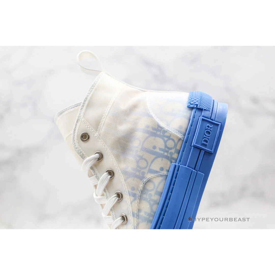 Two-tone blue and white sneakers with gradient effect is the main feature of Dior B23 High Top Gradient Blue. The upper of the sneakers showcase the clean white Dior Oblique Canvas with translucent overlay, while its soles give the pure blue tone hue. Most importantly, this blue hue reveals a gradient effect just above the soles which gives another style to the pair. Thus, as you walk with these Dior B23 High Top Gradient Blue sneakers, you will surely be the next center of attraction.
