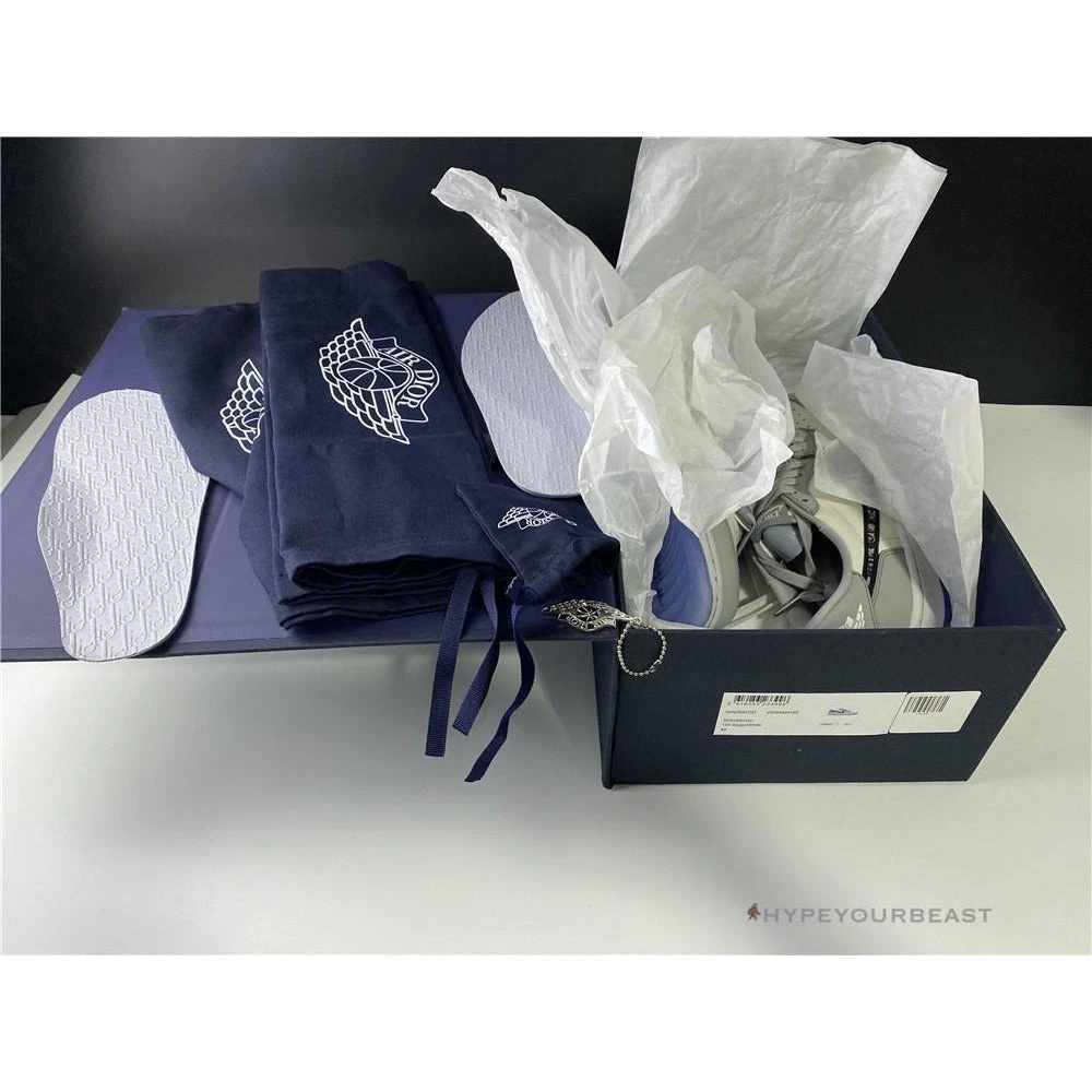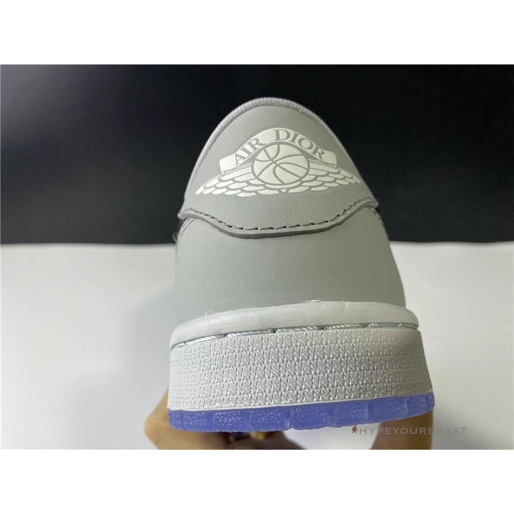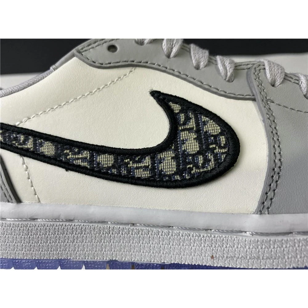 Elegant two-tone grey and white sneakers are generated from Dior and Jordan brand partnership. They made a low-top version through the Dior X Air Jordan 1 Low. These sneakers showcase white bases on the perforated toe and midfoot with light grey accents on the forefoot, side panels, eyelets, heel tabs, and heels. Most importantly, the low-top sneakers highlight the classic black Nike Swoosh created with the iconic Dior Oblique pattern. Other than that, Dior X Air Jordan 1 Low includes clear rubber outsoles featuring the Jordan Wings print with the Dior logo on the bottom.