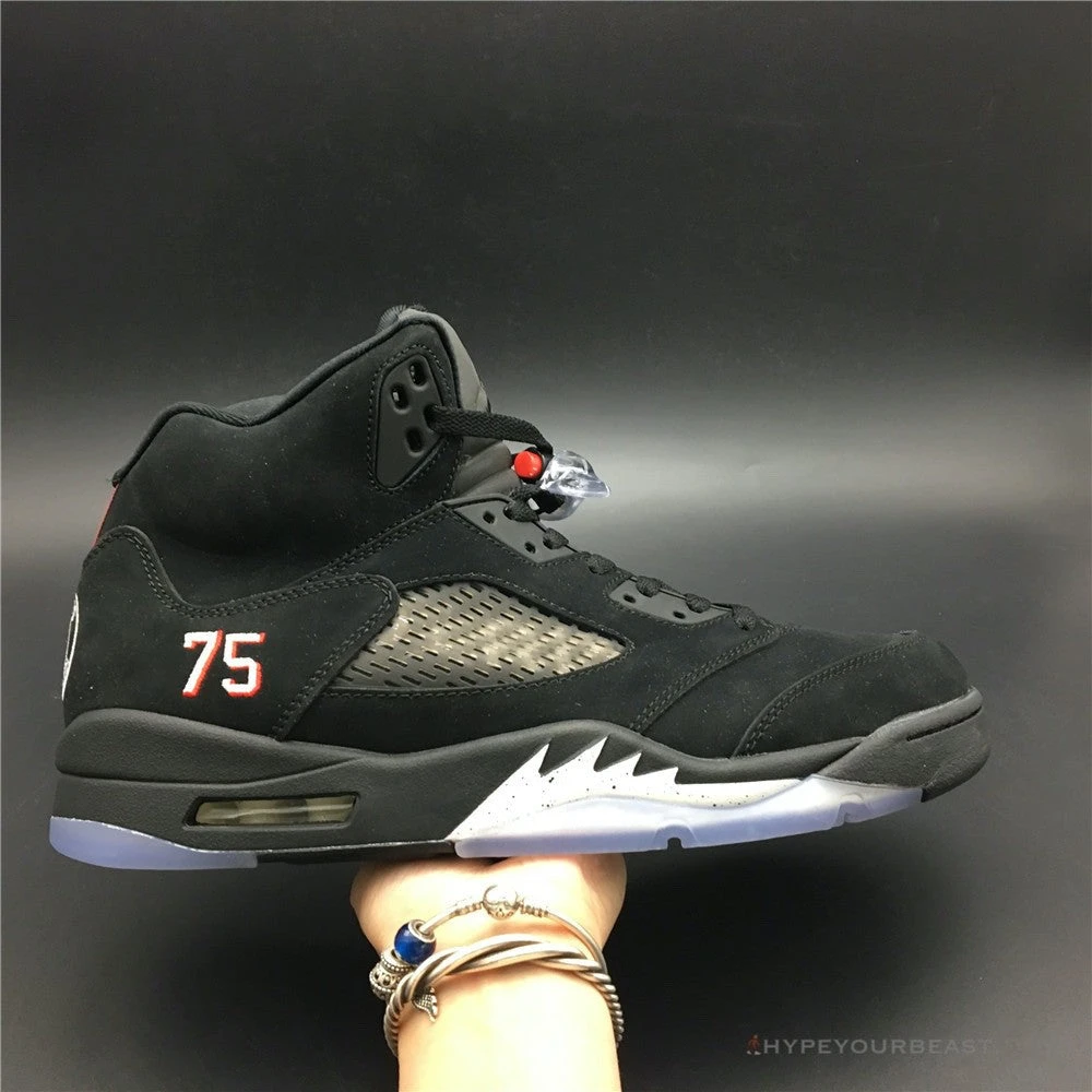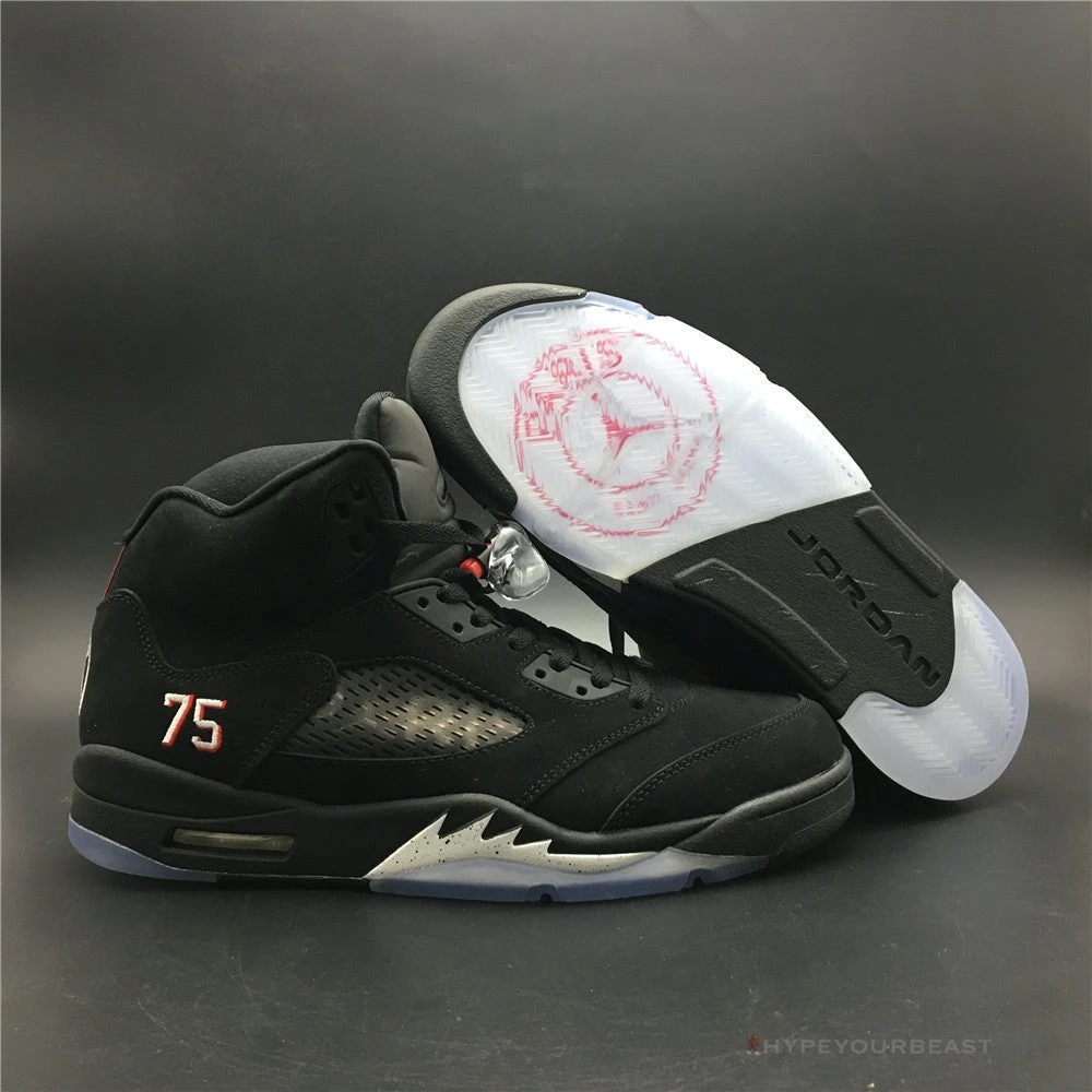 The fantastic collaboration of Jordan Brand and French professional soccer club PSG introduces an incredible pair of Air Jordan 5 Retro Paris Saint Germain. Its main colorway was inspired by the club’s uniforms, so it carries the black nubuck bases with white and red accents on the upper. The sneakers look to be all black-out from upper, but it also includes white and grey midsole tones with the visible Air technology features. Branding is also highlighted such as the “PARIS” text with Jumpman logo replacing the “A”, “75” embroidery on the sides, PSG x Air Jordan logo at the heels, and “Ici C’est” text inside each tongue. Air Jordan 5 Retro PSG indeed showcases all the captivating features of the two iconic brands.