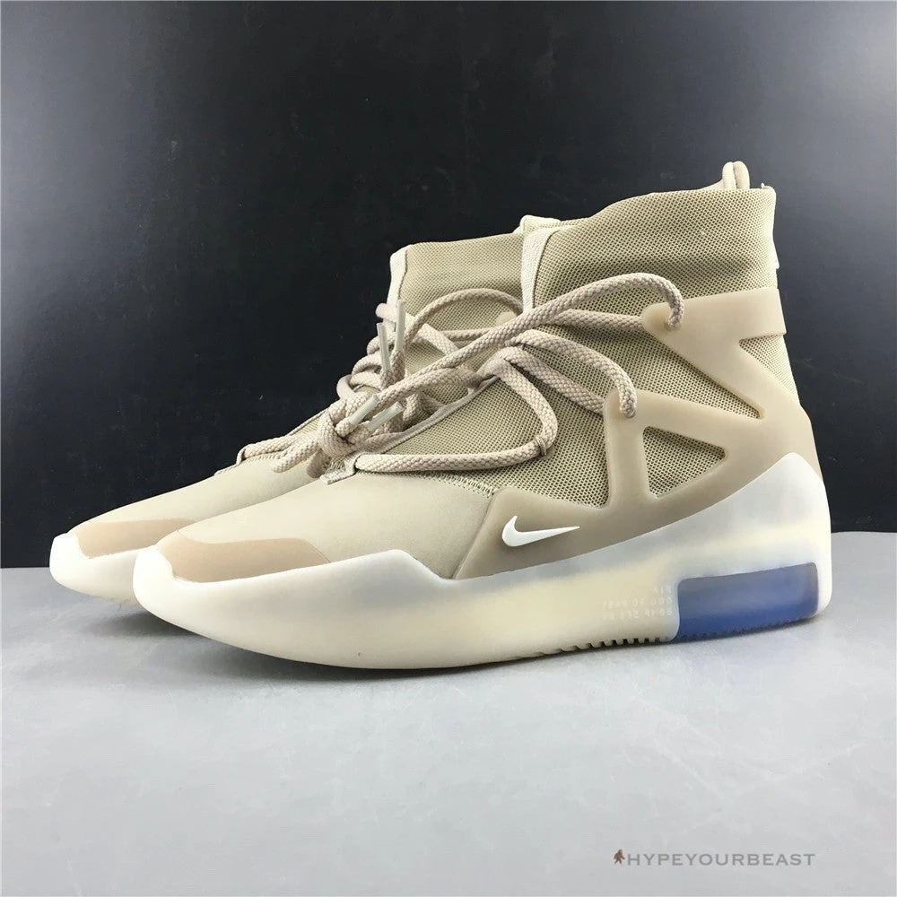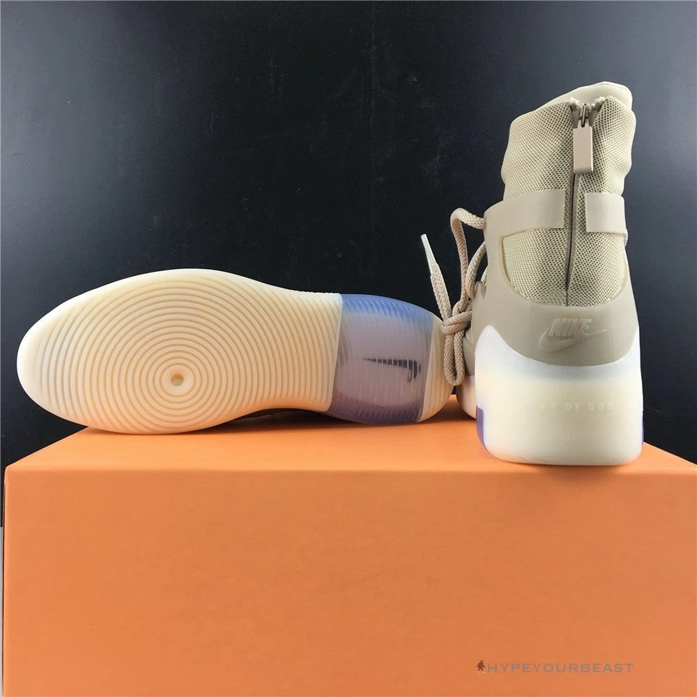 Nike Air Fear of God 1 Oatmeal brings out Oatmeal colorway and style. Nike x Jerry Lorenzo brings out a high-top bootie with earth-tone hues. It even showcases an Oatmeal upper knit with an Oatmeal TPU cage. However, Nike Air 1 Fear of God Oatmeal also presents thick translucent white midsoles with a slight sheer blue tone on the heel. The high-top boots are completed with a Zoom Air cushion and Nike Swoosh logo on the soles.