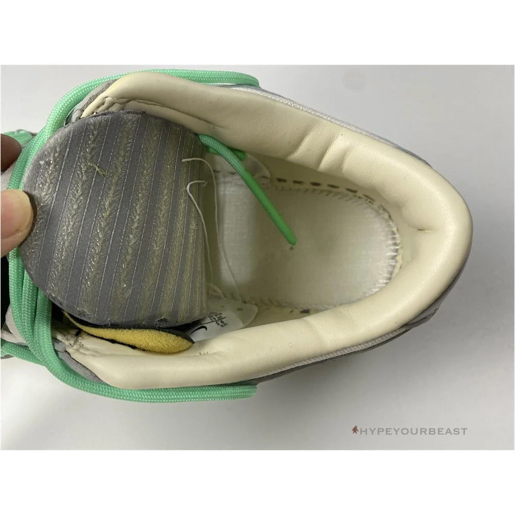 Off White X Nike Dunk Low Metallic Grey showcases two-tone style with extra mint green accents. The upper part brings out white leather with light grey overlays. It also carries a grey Nike Swoosh and another accessory on its midsoles. Besides the kicks impeccable rubber soles, Off White X Nike Dunk Low Metallic Grey is completed with an additional mint green lacing system.